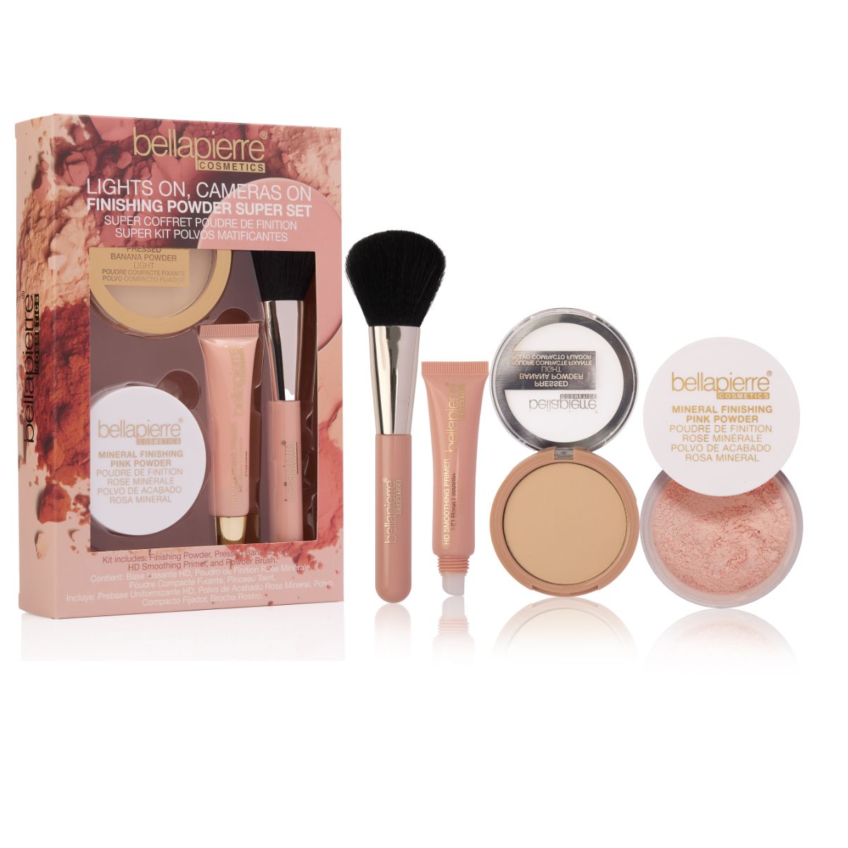 Obține un ten perfect cu Lights On Cameras On Finishing Powder Super Set de la Bellapierre, un kit complet creat pentru fixarea machiajului și obținerea unui aspect neted, uniform și luminos.